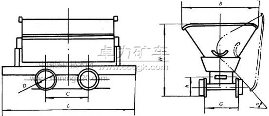 3.1 礦車型式為翻斗式,按車箱形狀分V型和U型。V型車一般以運輸松散密度在1800kg/m3以下的物料為主,多用于地表作業(yè);U型車一般以運輸松散密度在2500kg/m3以下的物料為主,多用于井下作業(yè)。