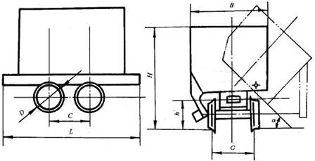 5.1.2 逐輛測(cè)定礦車(chē)的主要參數(shù):外形尺寸(長(zhǎng)、寬、高)、軸距、牽引高、輪對(duì)軌距和卸載角。