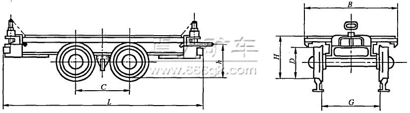 | 型號 | 裝載 量/t | 軌距G | 外型尺寸 | 軸距 C | 輪徑 D | 牽引 高度 h | 允許 牽引 力/kN | 最小平 面運(yùn)行 半徑 m |